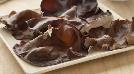 Jamur kuping kering yg telah direndam dan mengembang potong bonggolnya lalu dipotong ukuran mudah dikunyah.